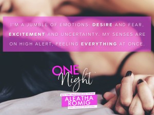 If you’re looking for a low on angst steamy read, this one just might hit the spot. This was my second Aleatha Romig book and although at times I really enjoyed it, there were just a few things that bothered me about the story. That’s not to say that I didn’t like ONE NIGHT, I did, but I LOVED her previous book, PLUS ONE so much more.